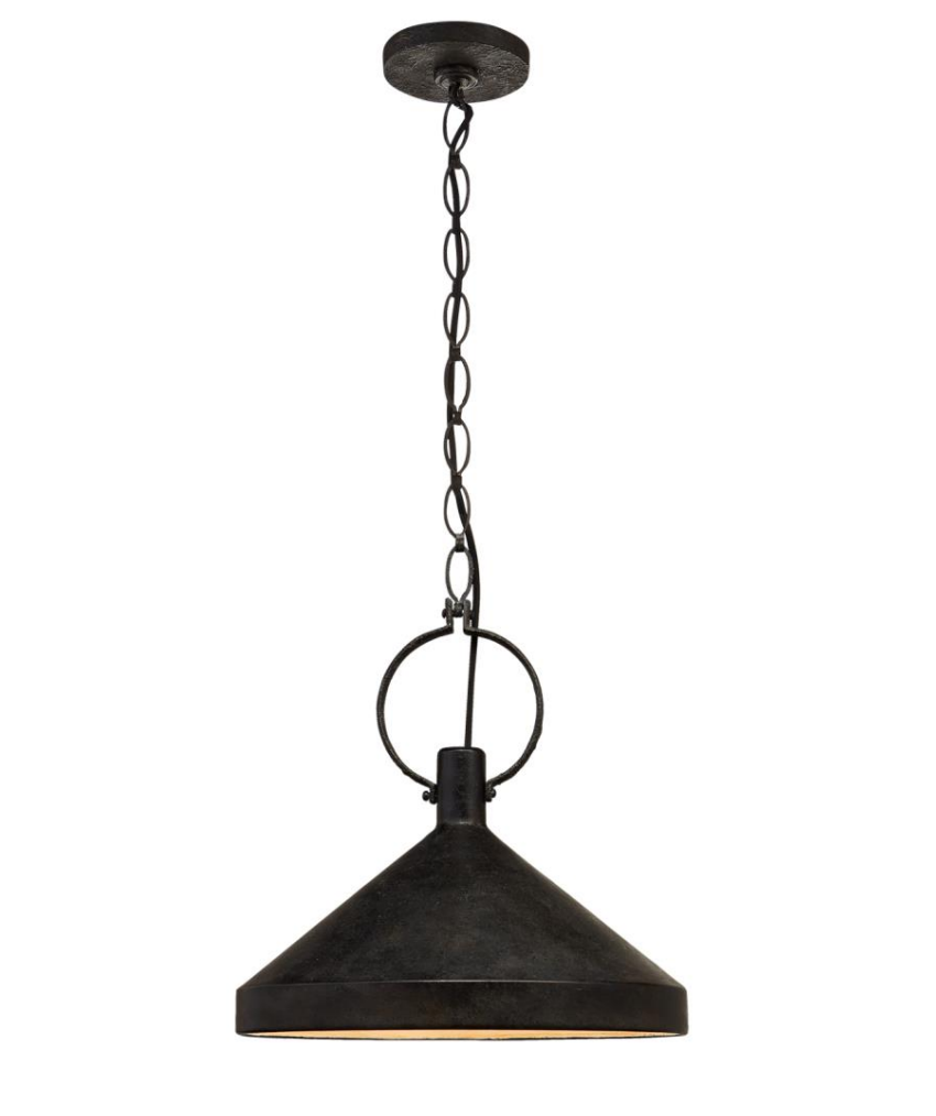 Lampa wisząca Limoges Large Suzanne Kasler marki Visual Comfort z postarzanego żelaza ze stożkowym kloszem w kolorze czarnym rzuca staroświecki blask przypominający Paryż nocą. Wymiary: wys. 41.9 x szer. 41.9 cm