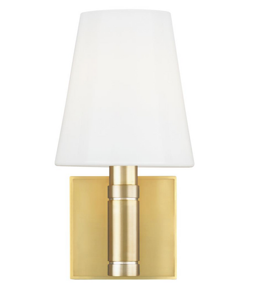 Kinkiet Beckham Classic projektu Thomas O'Brien marki Visual Comfort w polerowanym mosiądzu z białym szkłem. Wymiary: wys. 27.3 x szer. 14 cm