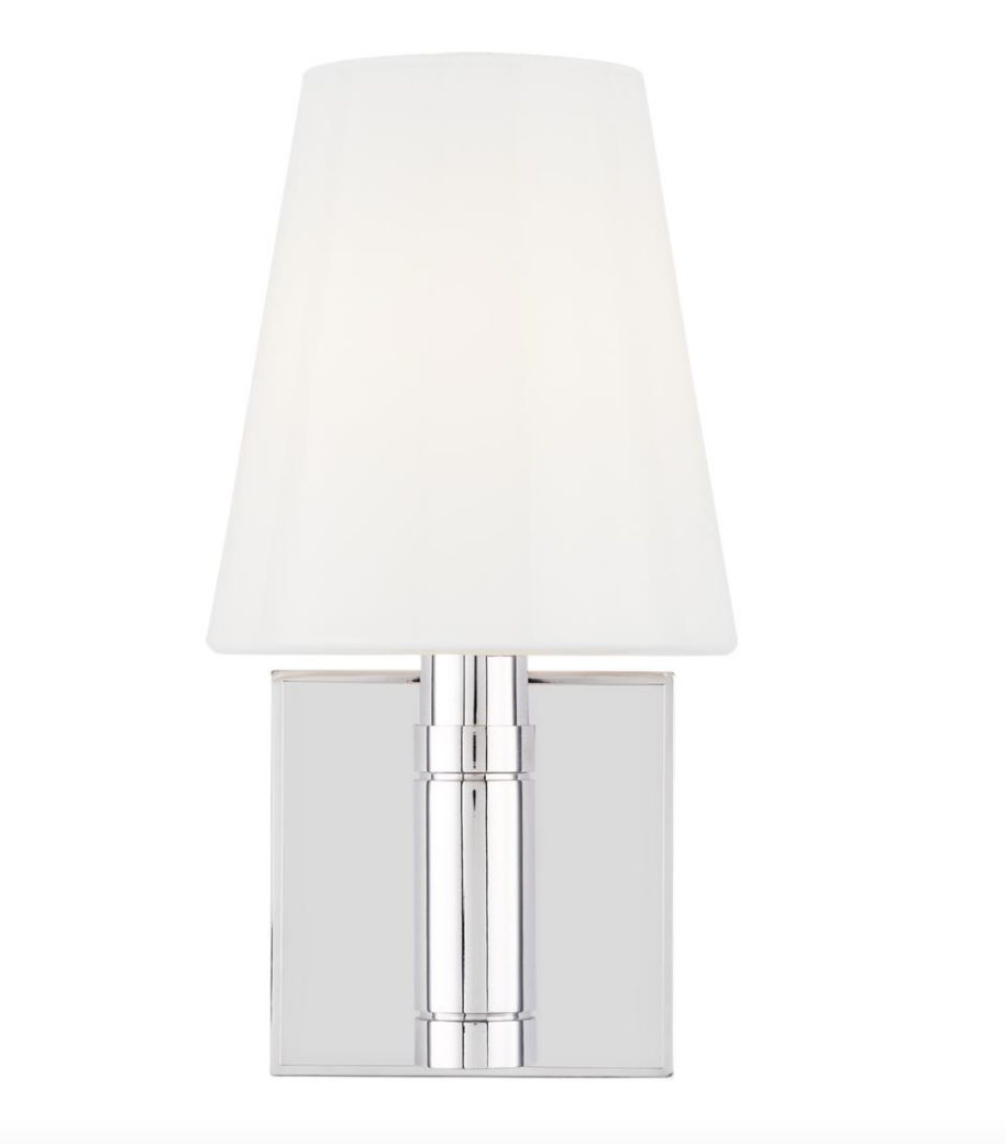 Kinkiet Beckham Classic projektu Thomas O'Brien marki Visual Comfort w polerowanym niklu z białym szkłem. Wymiary: wys. 27.3 x szer. 14 cm