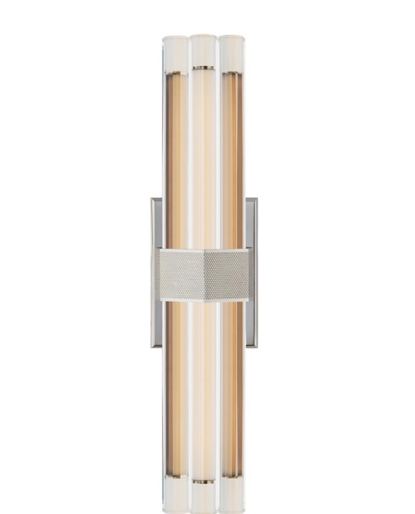 Kinkiet Fascio 18" projektu Lauren Rottet marki Visual Comfort w polerowanym niklu wykończony kryształem. Lampa posiada diodę LED. Wymiary: wys. 45.7 x szer. 10.8 cm