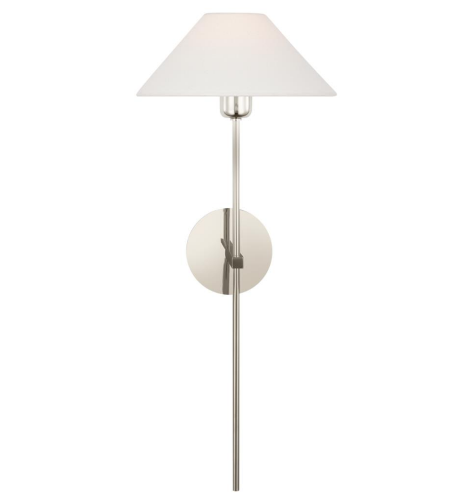 Kinkiet Hackney 25" projektu J. Randall Powers marki Visual Comfort z polerowanego niklu wykończony lnianym abażurem. Lampa posiada gniazdo na żarówkę E 14. Wymiary: wys. 63.5 x szer. 27.3 cm
