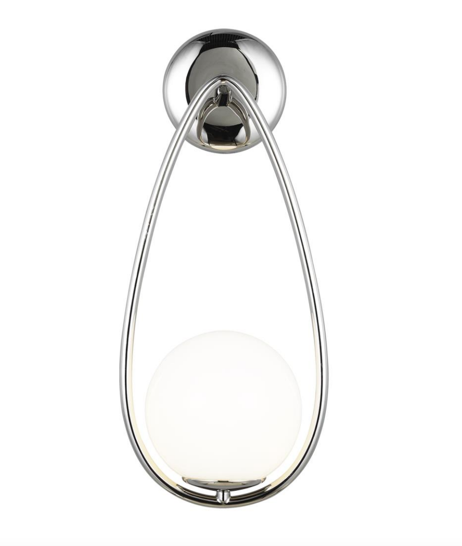 Kinkiet Galassia One projektu Aerin marki Visual Comfort wykończony w polerowanym niklu z białym szkłem. Wymiary: wys. 47.6 x szer. 20.3 cm