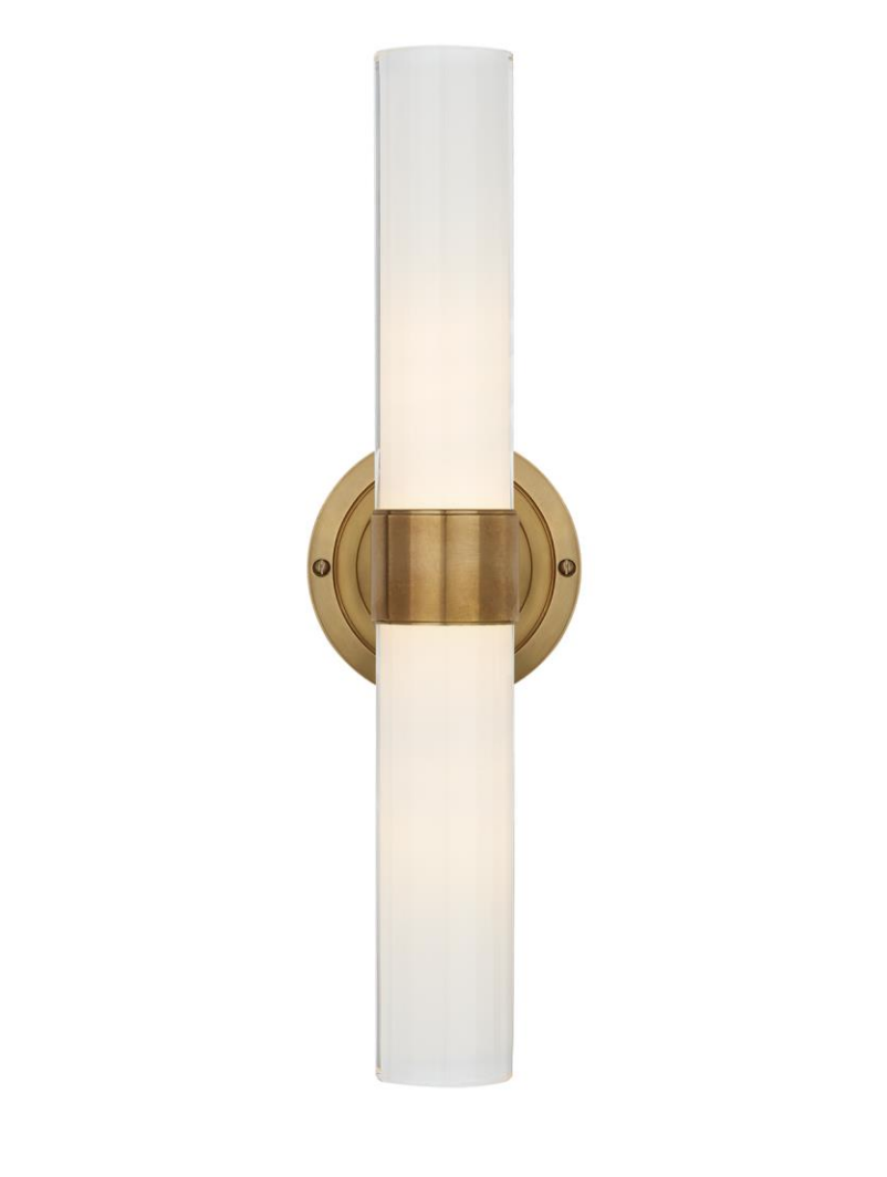 Kinkiet Jones Medium Double marki Ralph Lauren Home w kolorze naturalnego mosiądzu z białym szkłem. Wymiary: wys. 45.7 x szer. 12.7 cm