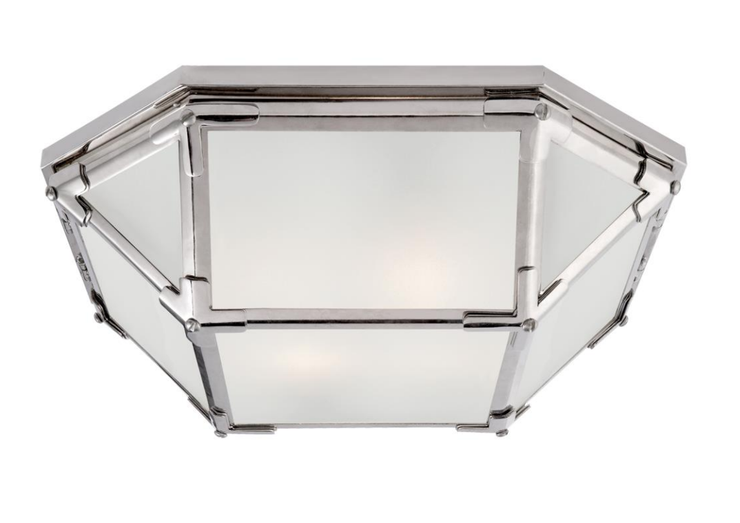 - Plafon Morris projektu Suzanne Kasler, w którym przezroczyste lub białe szklane tafle zdobią geometryczną ramę w prezentowanym modelu z antycznego cynku, dostępny także w polerowanym niklu lub pozłacanym żelazie.