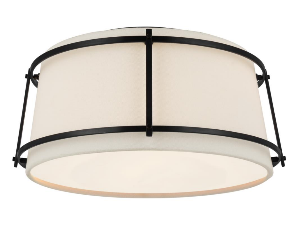 Plafon Callaway Small projektu Carrier and Company marki Visual Comfort posiada lniany bębnowy abażur zawieszony na konstrukcji w kolorze brązowym. Odsłonięte śruby podkreślają utylitarną estetykę. Wymiary: wys. 15.2 cm x szer. 31.8 cm