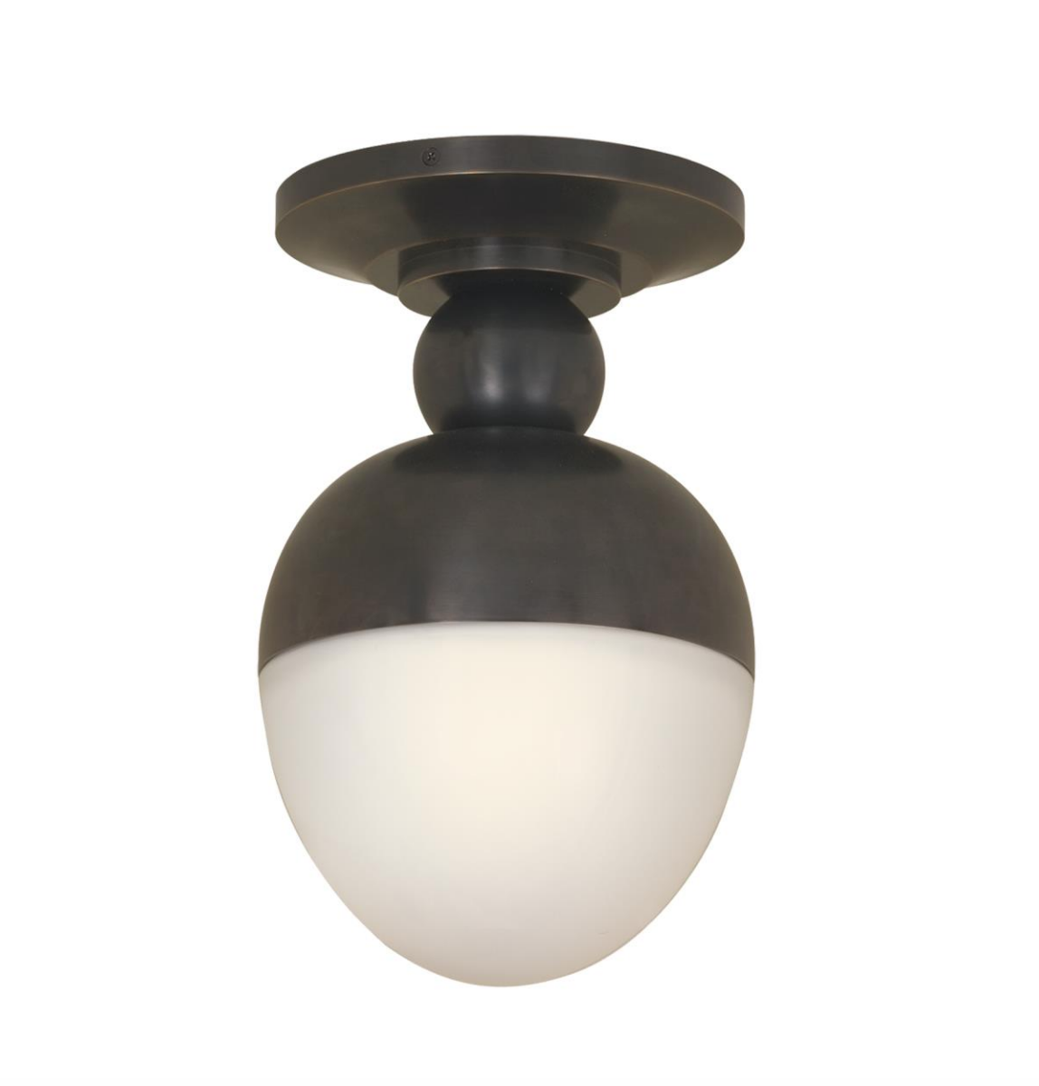 - Plafon Clark projektu Thomas O'Brien marki Visual Comfort w kolorze brązowym z białym szkłem.