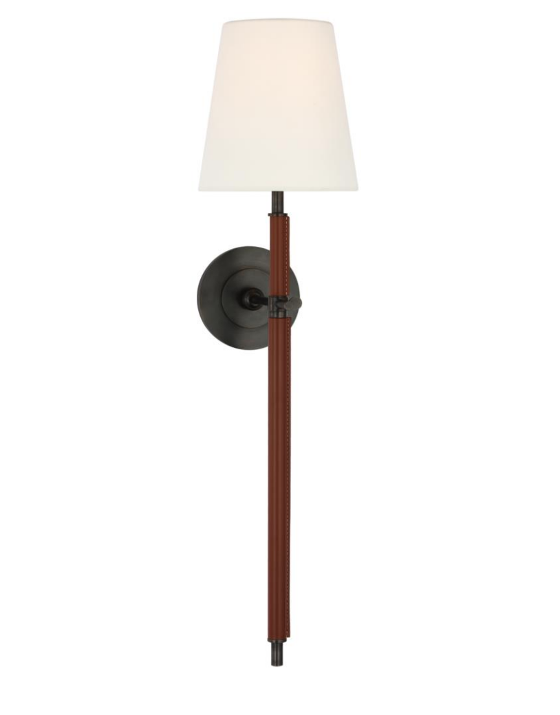 - Kinkiet Bryant Large Wrapped projektu Thomas O'Brien marki Visual Comfort z ręcznie polerowanego mosiądzu antycznego i skóry czekoladowej z lnianym abażurem.