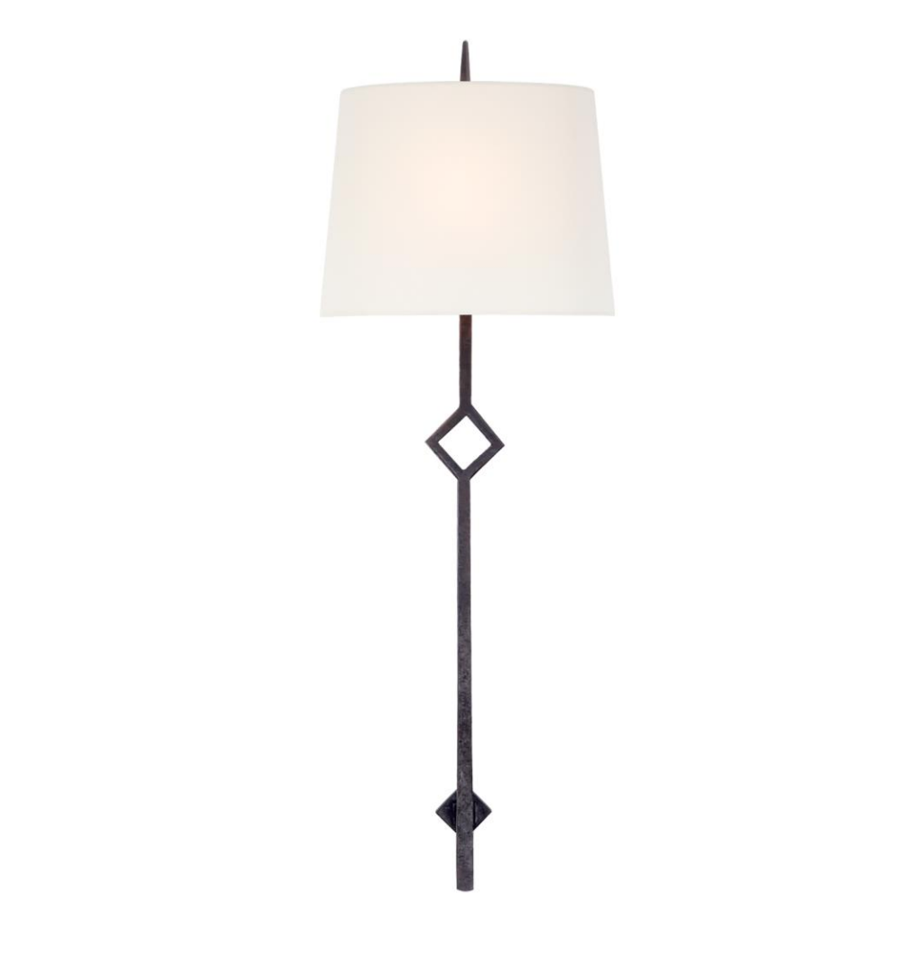 Kinkiet Cranston Large  projektu Studio VC  w kolorze postarzanego żelaza wykończony lnianym abażurem. Lampa posiada gniazdo na żarówkę E27. Wymiary: 94 x 33 x 12,1 cm.