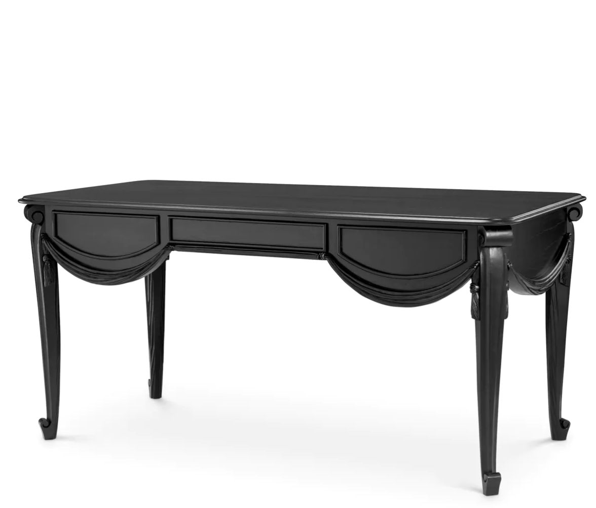 • Biurko Zafiro firmy Eichholtz wykonane z drewna, wykończone w klasycznej czerni, charakteryzuje się unikalnym, drapowanym efektem, przypominającym miękkie fałdy zasłony, posiada praktyczną szufladę.