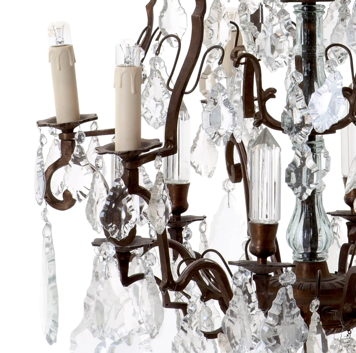 • Żyrandol Château De Wideville Luster marki Eichholtz posiada antyczną mosiężną oprawę z lśniącymi, przezroczystymi szklanymi kroplami i sześcioma oprawami w kształcie świec.