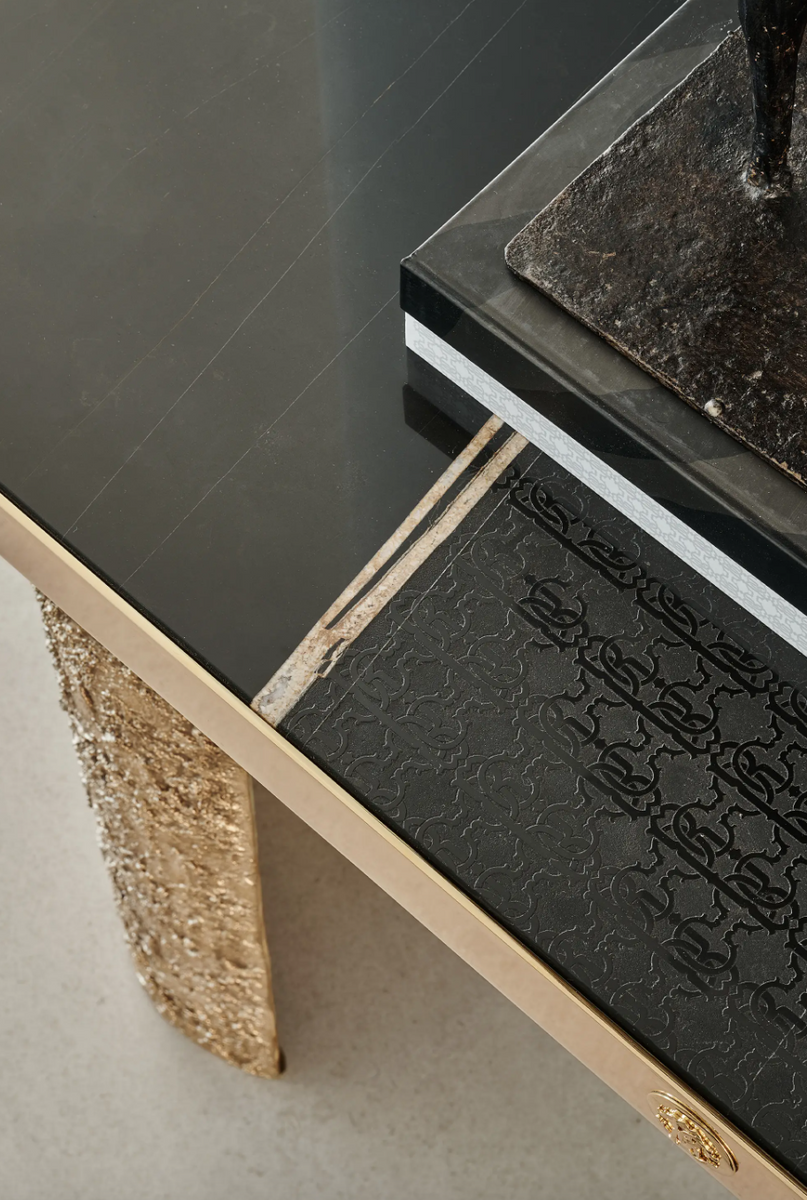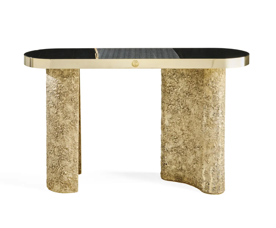 - Konsola Moco marki Roberto Cavalli Home Interiors z podstawą z odlewu mosiężnego, z metalową ramą w złotym wykończeniu. Blat z polerowanego marmuru Sahara Noir z częściowo grawerowanym monogramem RC.