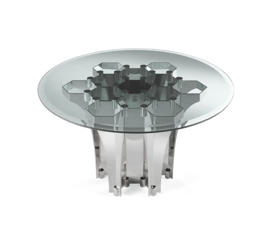 Stolik Soho marki Roberto Cavalli Home Interiors z metalową podstawą w wykończeniu błyszczącym lub szczotkowanym z blat ze szkła przezroczystego, brązowanego lub dymionego, fazowanego. Wymiary: ø 80 wys. 45 cm