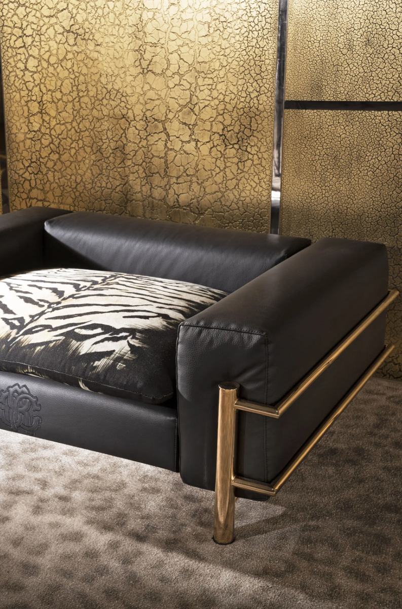 - Legowisko dla psa Wild Roberto Cavalli Home Interiors z konstrukcją z drewna topolowego i pianki poliuretanowej. Rama z żelaznego pręta w kolorze złotym. Tapicerka z eko skóry w kolorze czarnym.