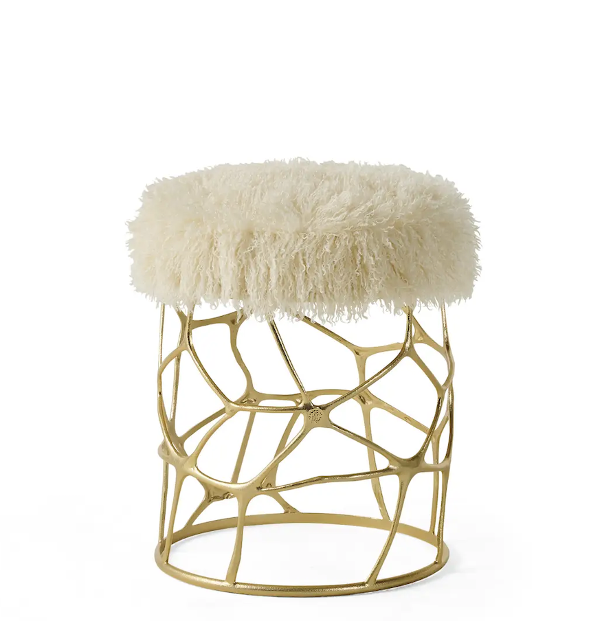 - Puf Sioraf marki Roberto Cavalli Home Interiors ma poduszkę siedziska z drewna topolowego i pianki. Tapicerkę z tkaniny kat. A oraz metalową podstawę w wykończeniu Wrought Gold, Wrought Dark Bronze lub matowa czerń.