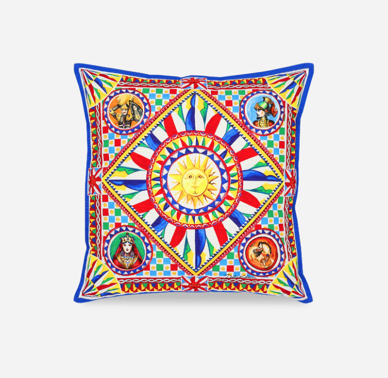 Poduszka płócienna Dolce&Gabbana Carretto Siciliano, nawiązuję kolorystyką do sycylijskiego folkloru, wykończona płaską bordiurą, która podkreśla obfite wypełnienie. Pokrycie: 100% bawełna. Wypełnienie: 100% poliester. Wymiary: 45 x 45 cm