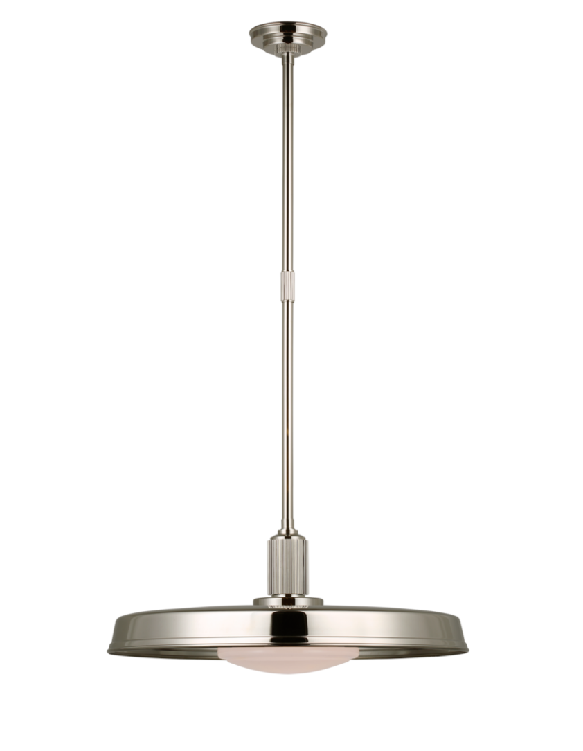 Lampa wisząca Ruhlmann 24" projektu E.F.Chapman marki Visual Comfort z polerowanego niklu z białym zskłem. Wymiary: wys. 117.5 x szer. 25.4 cm.