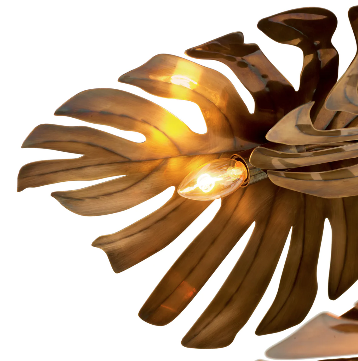 Żyrandol Tropique marki Eichholtz, w stylu vintage, w kolorze antycznego mosiądzu, inspirowany bujną formą Monstery, warstwowe liście przywodzą na myśl rzeźbiarską elegancję i naturalne piękno. Wymiary: szer. 75 x głęb. 76 x wys. 58 cm