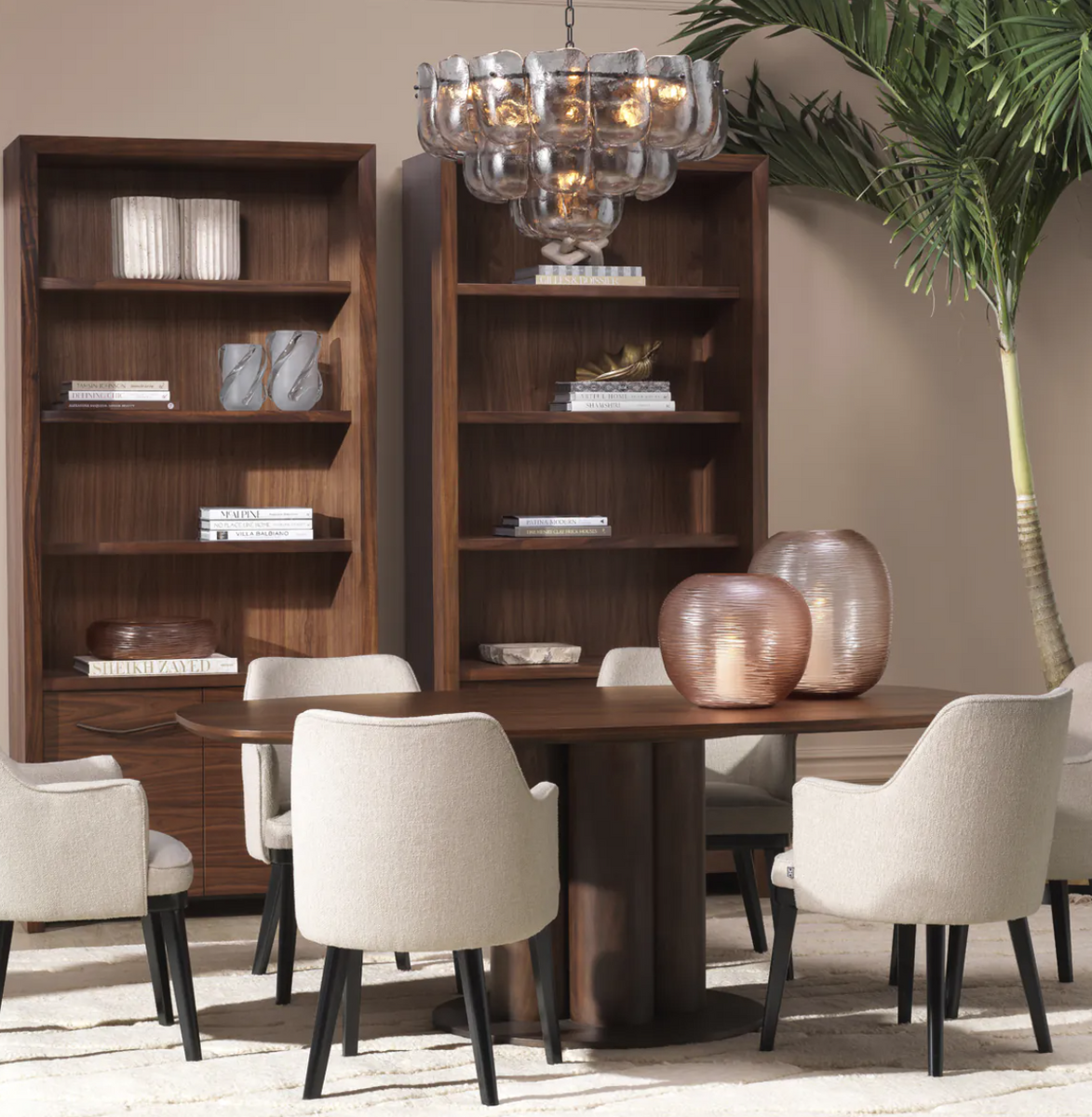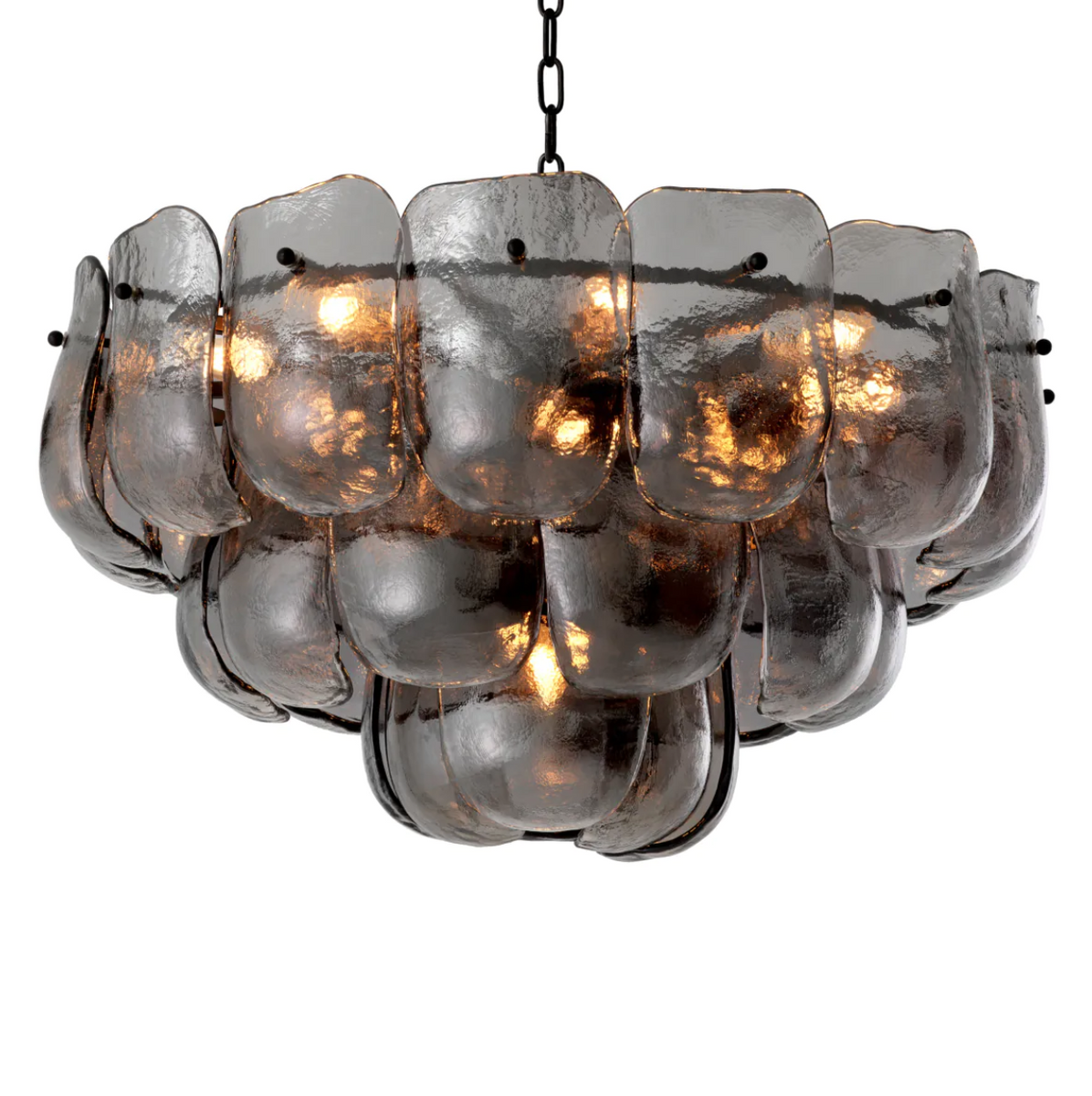 - Żyrandol Gustave marki Eichholtz charakteryzuje się dymnym szkłem zestawionym z wyrazistym, brązowym wykończeniem, emanującym uwodzicielskim blaskiem. Gruba szklana konstrukcja dodaje odrobinę majestatu.