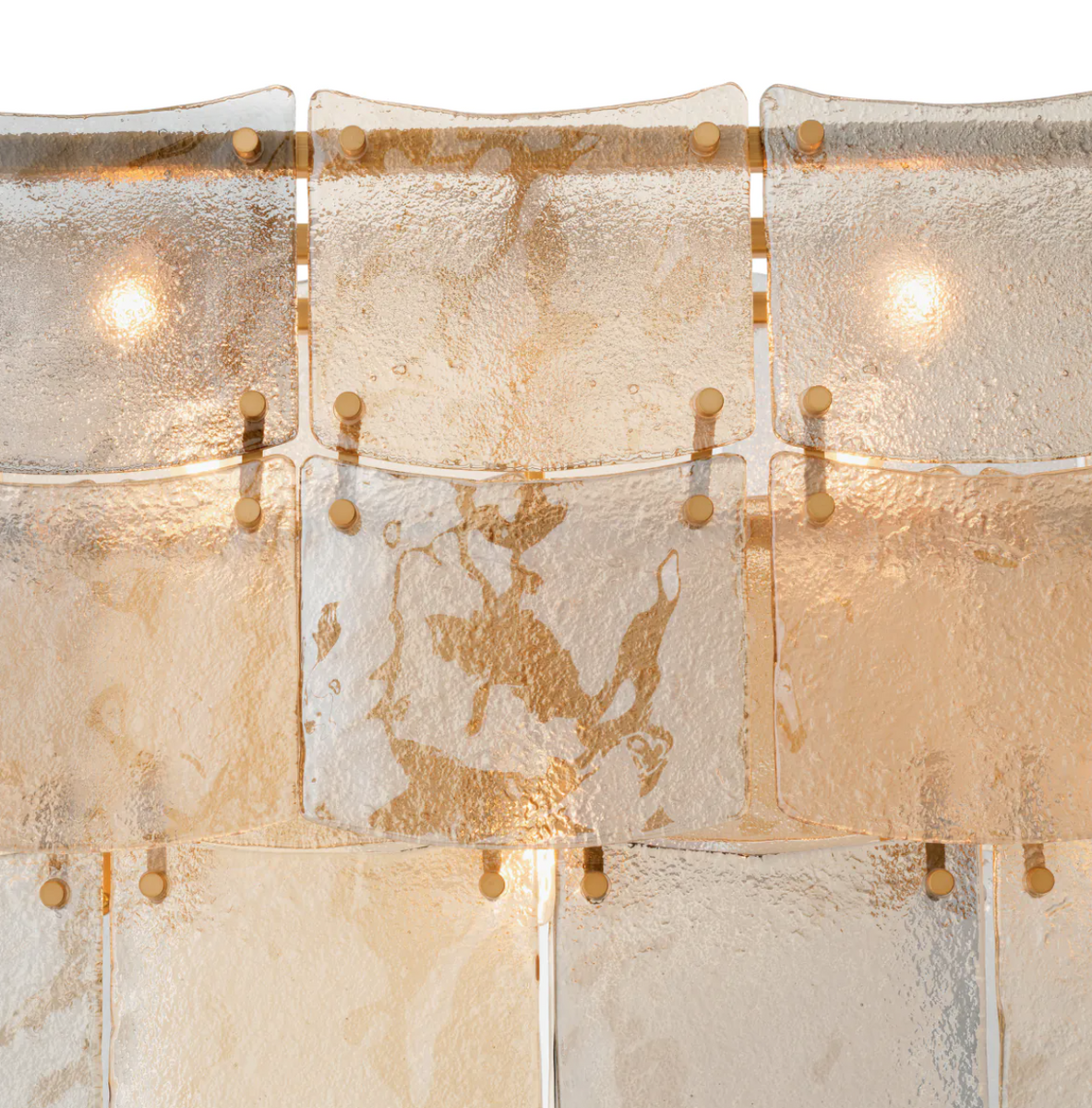- Żyrandol Laurent prostokątny marki Eichholtz w kolorze antycznego mosiądzu z eleganckimi liniami. Jego przydymione szkło i panele w kolorze szampańskim tworzą ciepłą poświatę.