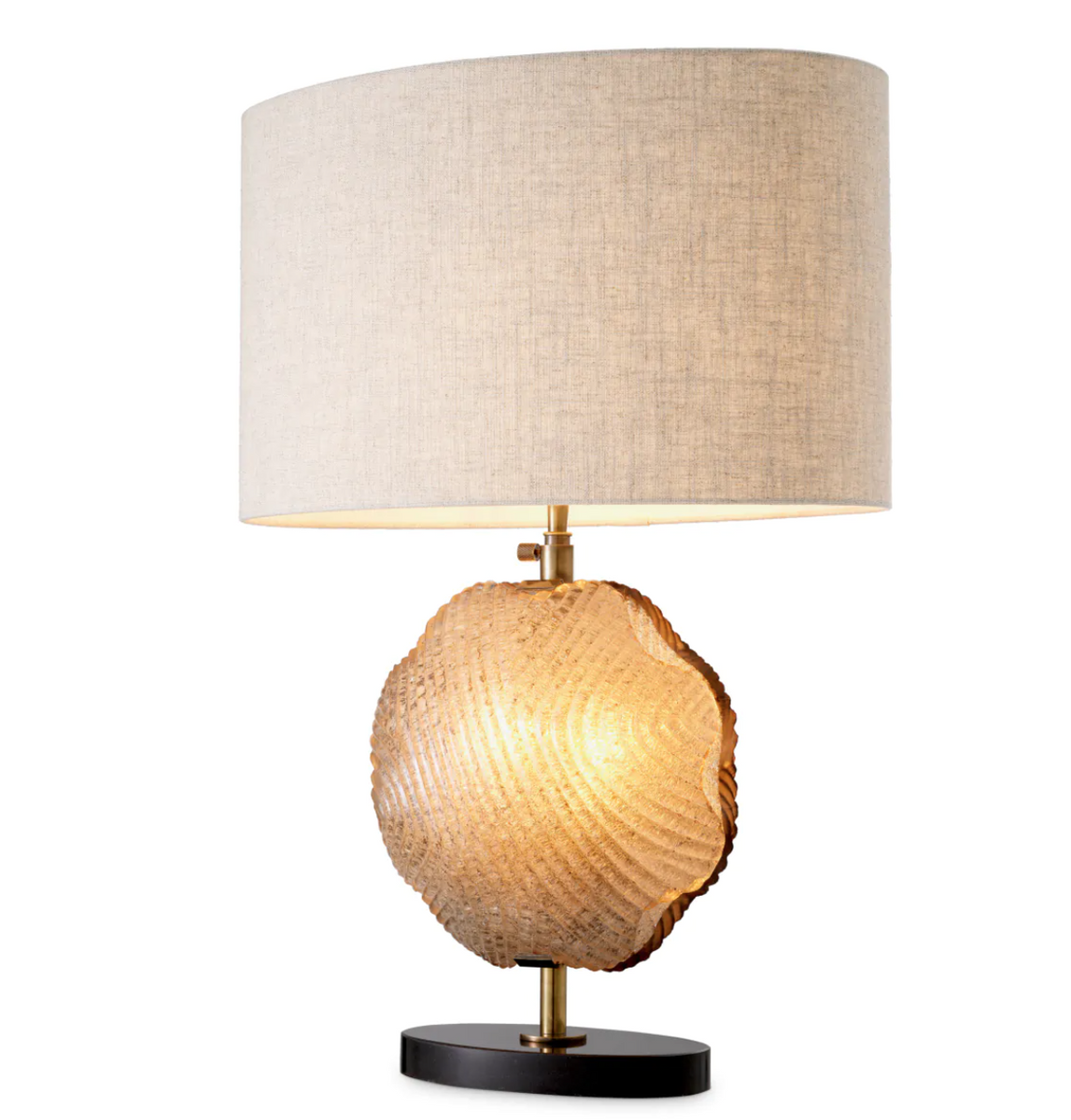 - Lampa stołowa Nuria marki Eichholtz w której delikatny blask ręcznie robionego, posypanego cukrem szkła uzupełniają akcenty z mosiądzu w stylu vintage i lniany abażur. Ma dwa źrodła światła.