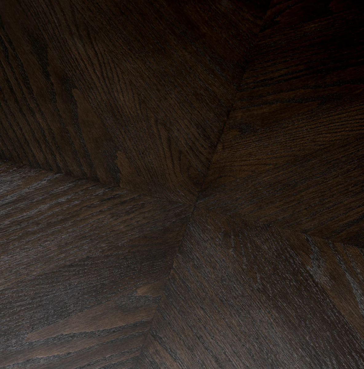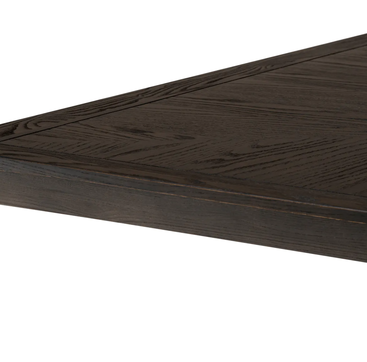 - Stół Rexton marki Eichholtz z forniru dębowego w kolorze hebanowym, wykończony w kolorze antycznego mosiądzu, łączy głębokie tony z nowoczesną sylwetką.