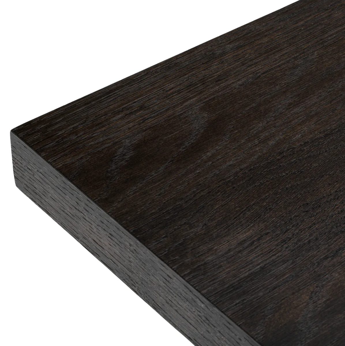 • Stolik boczny Bravon marki Eichholtz z hebanowego forniru dębowego z wyrazistym, młotkowanym wzorem. Lśniące wykończenie blatu podkreśla naturalne usłojenie.