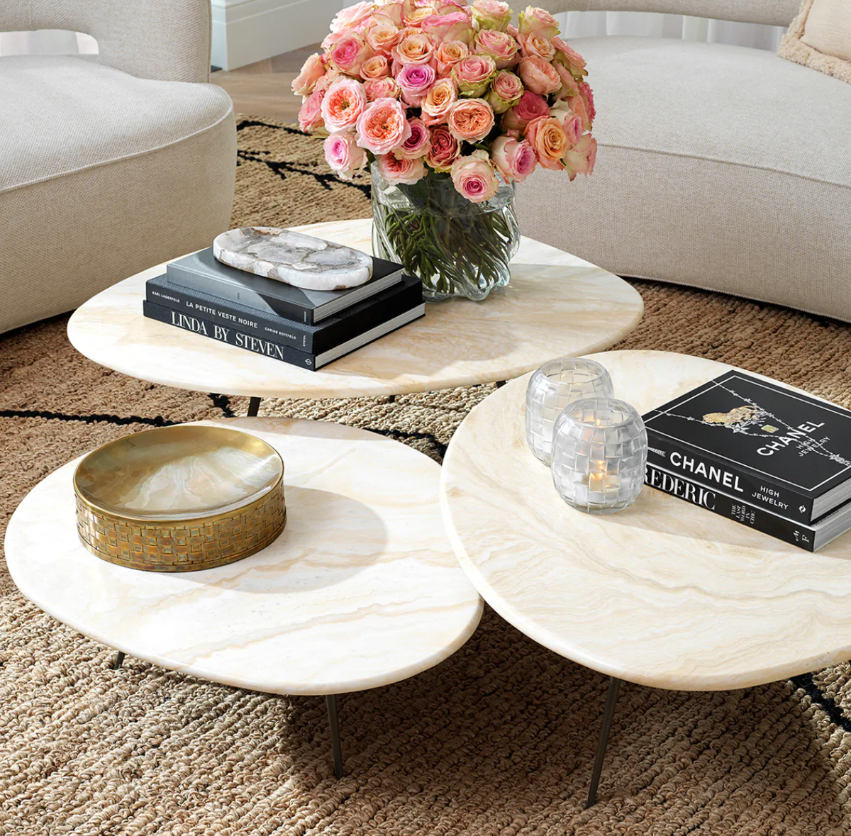 • Stolik kawowy Portofino L marki Eichholtz z onyksowym blatem i smukłymi, zwężającymi się nogami. Kremowa powierzchnia onyksu ma miękkie, płynne usłojenie i świetlistą głębią, która odbija światło.