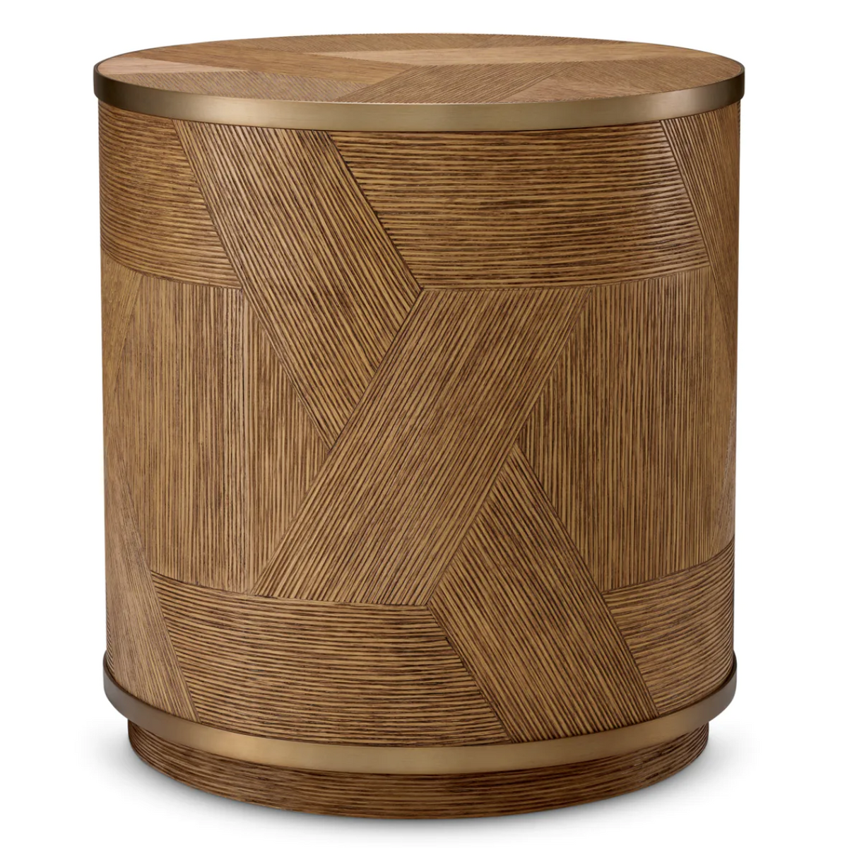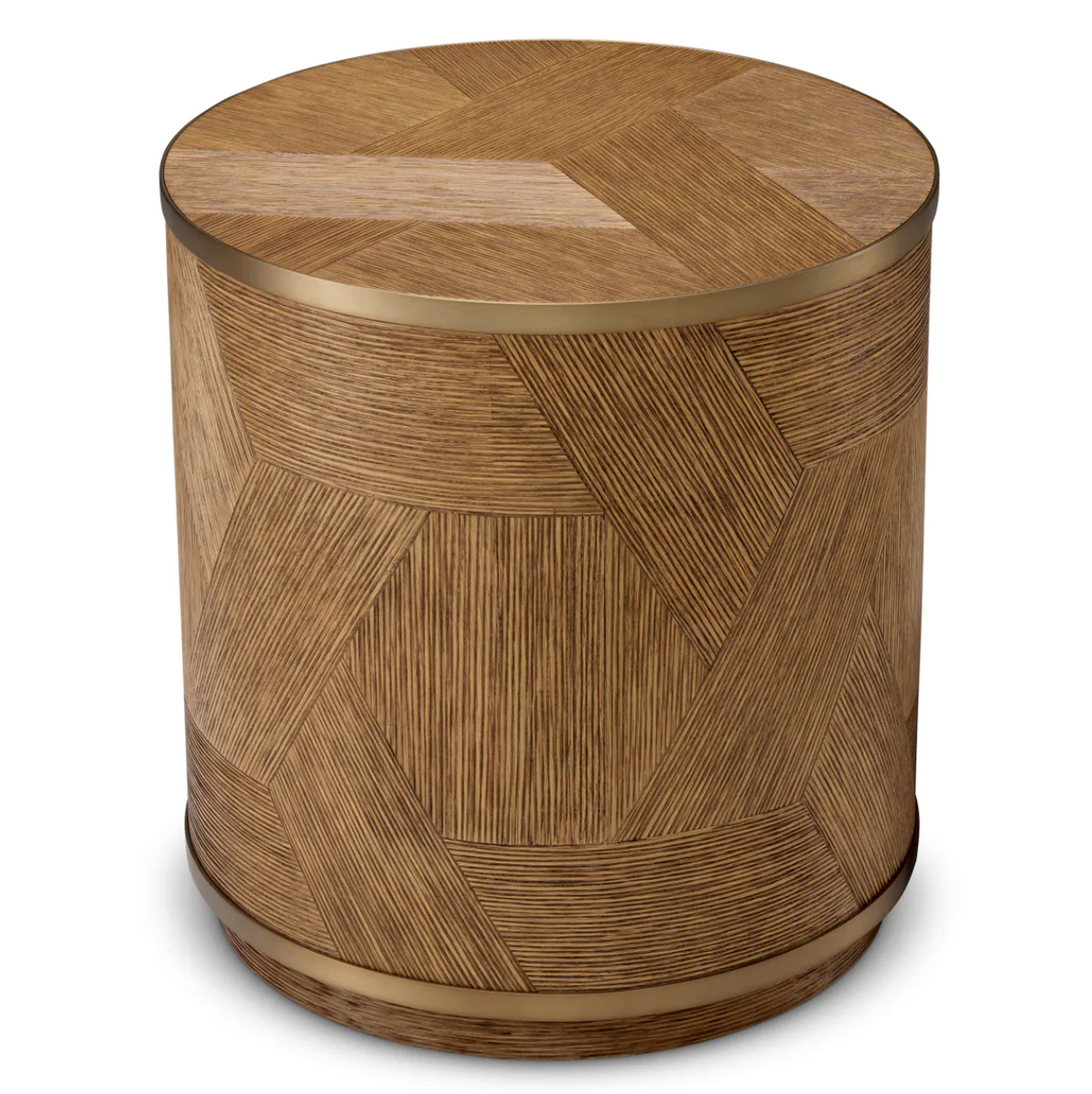 Stolik boczny Velutto marki Eichholtz w karmelowym fornirze dębowym z detalami w szczotkowanym mosiądzu, oferuje wyrafinowany kontrast ciepłych odcieni drewna i lśniącego metalu. Wymiary: Ø 50 | wys. 53,5 cm