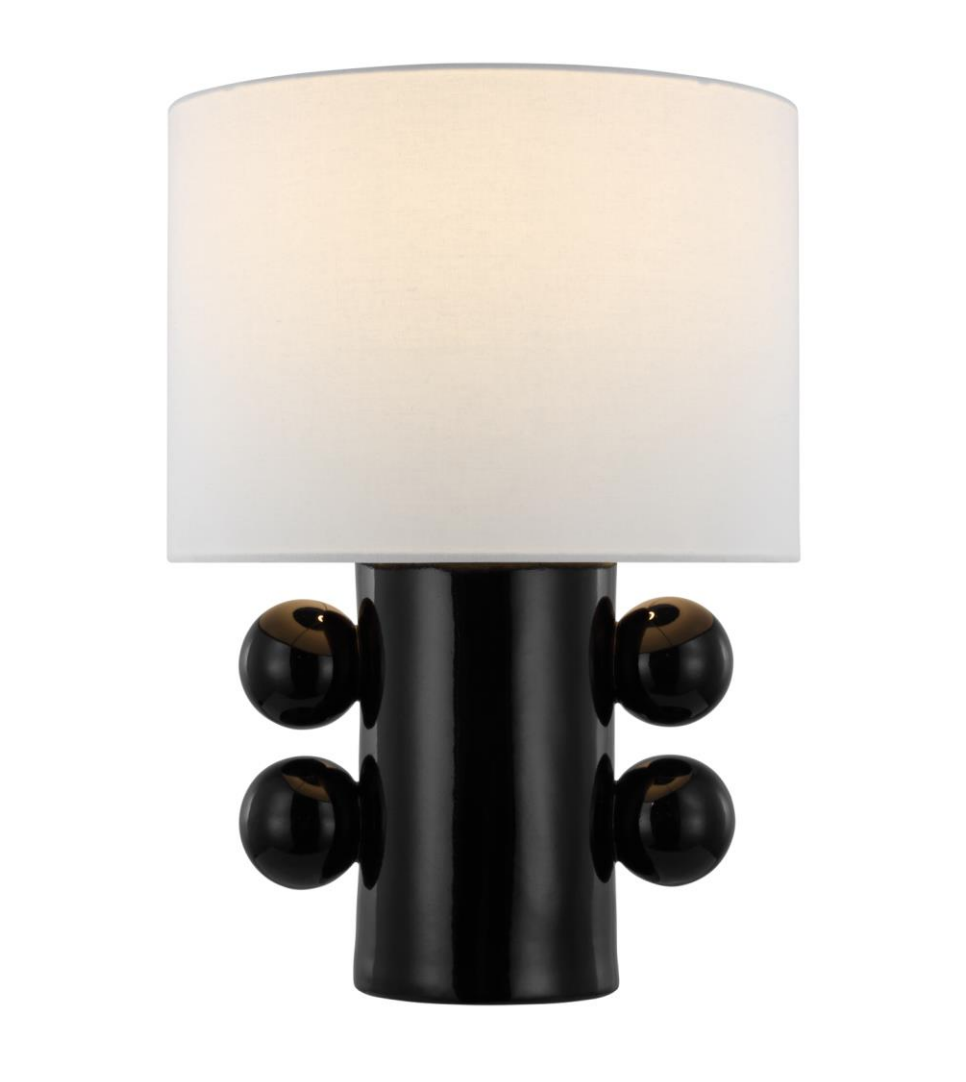 • Lampa stołowa Tiglia projektu Kelly Wearstler marki Visual Comfort w czarnym kolorze, wykończona lnianym abażurem. Lampa posiada gniazdo E 27.