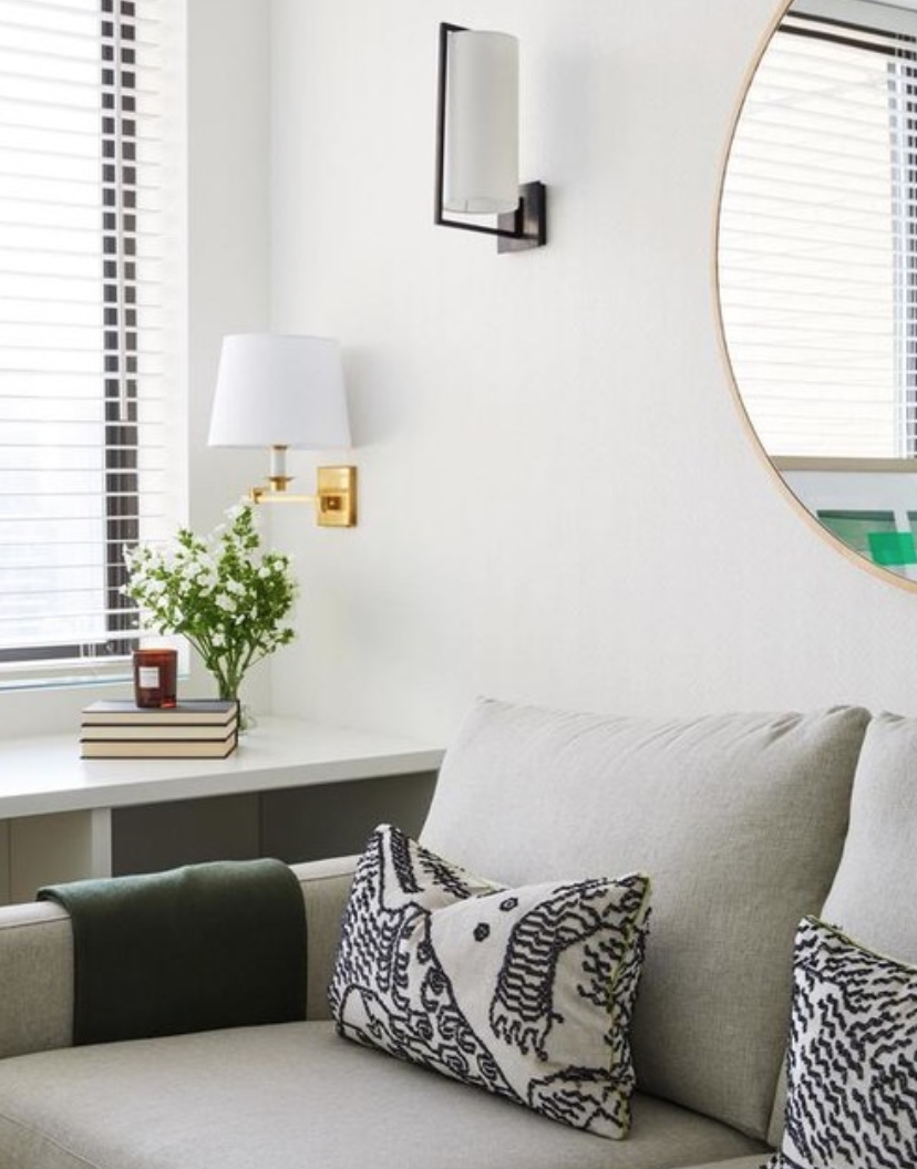 - Kinkiet Evans Swing Arm marki Ralph Lauren Home z litego mosiądzu, charakteryzuje się ściętą podstawą i otwartym od góry abażurem z bawełnianego perkalu. Posiada wbudowany ściemniacz i wysuwane ramię.