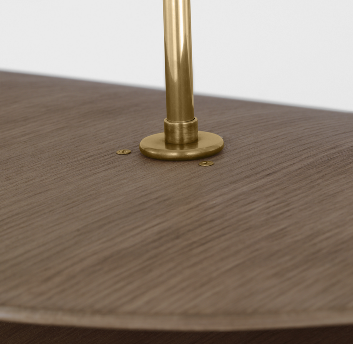 • Żyrandol Mahalo 32" projektu Windsor Smith wykończony w kolorze naturalnego dębu z detalami z ręcznie przecieranego antycznego mosiądzu z białym szkłem.