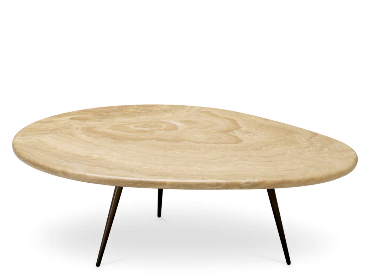 • Stolik kawowy Portofino S marki Eichholtz z onyksowym blatem i smukłymi, zwężającymi się nogami. Kremowa powierzchnia onyksu ma miękkie, płynne usłojenie i świetlistą głębią, która odbija światło.