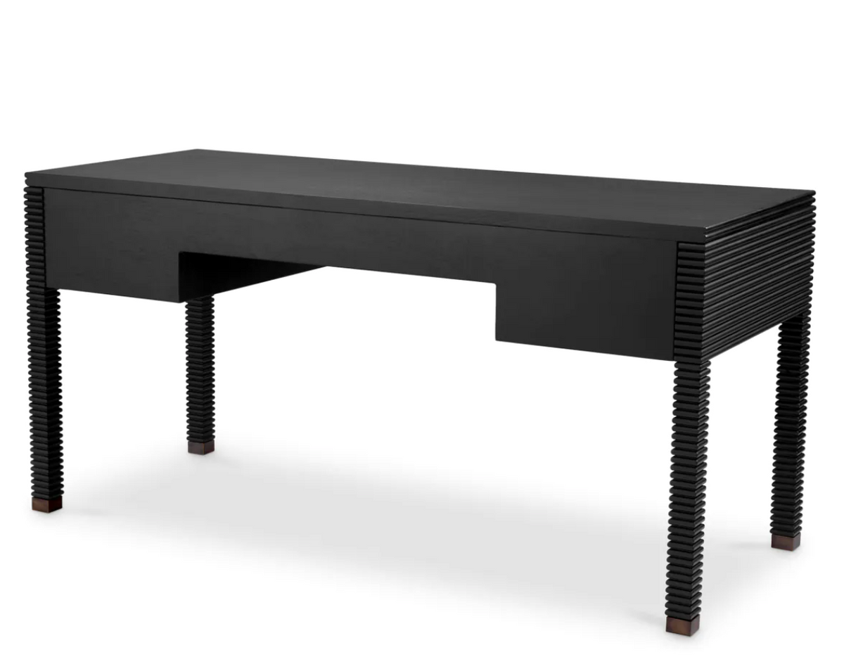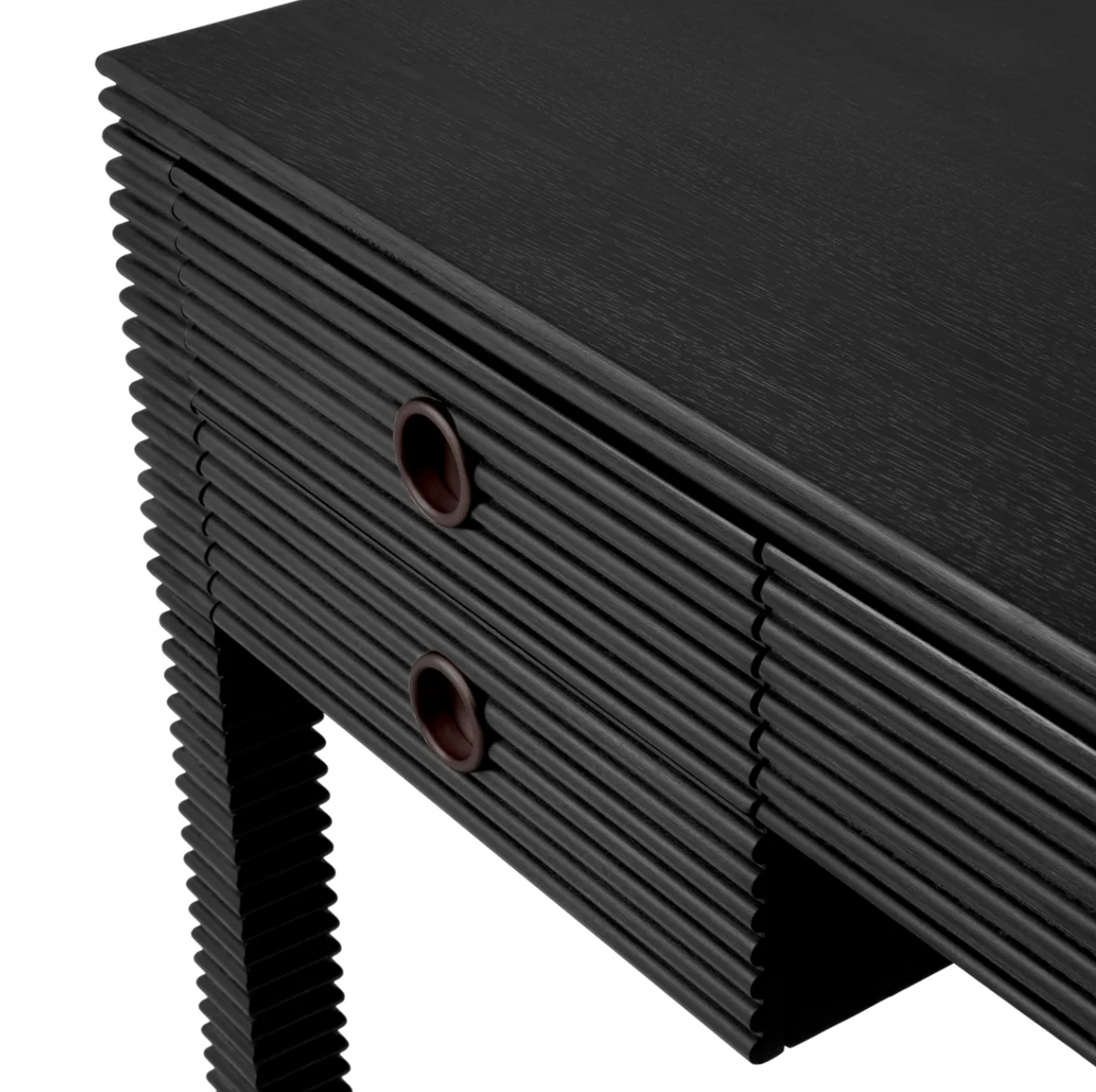 - Biurko Dimitrios marki Eichholtz z antracytowego forniru dębowego z eleganckimi brązowymi okuciami zachwyca połączeniem stylu i funkcjonalności. Wyposażone w pięć pojemnych szuflad.