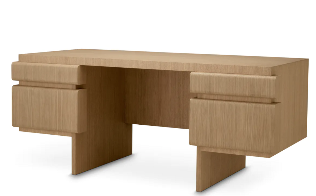 Biurko Colston marki Eichholtz wykonanym z szlachetnego forniru dębowego o naturalnym wybarwieniu. Delikatnie wysunięte szuflady tworzą subtelną grę głębi, nadając meblowi elegancki, nowoczesny charakter. Ciepłe odcienie drewna i gładkie wykończenie wprowadzają do wnętrza spokojną, harmonijną atmosferę, łącząc naturalne materiały z współczesnym designem. Biurko Colston to ponadczasowy akcent luksusu, doskonały do eleganckiego biura lub domowej przestrzeni pracy.