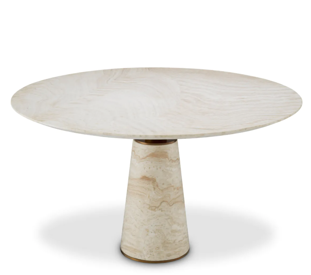 - Stół Genova marki Eichholtz łączy naturalne piękno trawertynu ze szczotkowanym wykończeniem mosiądzu, tworząc elegancki akcent w jadalni. Ciepłe, ziemiste tony nadają wnętrzu subtelny luksus i wyjątkową harmonię.