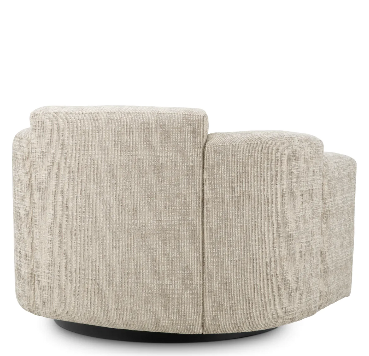 - Fotel obrotowy Marbella marki Eichholtz zachwyca gładkim wykończeniem tkaniny Creststone i nowoczesną czarną podstawą, łącząc ciepłe tonacje z współczesnym designem.