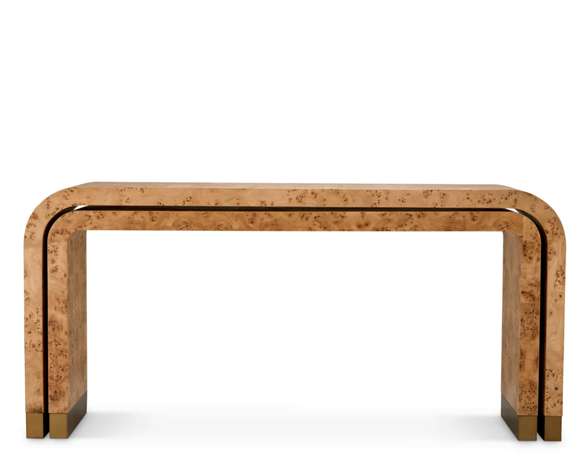 - Konsola Quinton marki Eichholtz zestaw dwóch sztuk z luksusowego forniru z jasnobrązowego czeczotu topoli, zachwycają wykończeniem w odcieniu postarzanego mosiądzu.