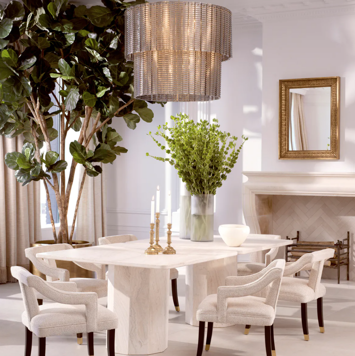 - Stół Piazza marki Eichholtz w którym zdecydowane linie i ponadczasowa forma podkreślają piękno naturalnego trawertynu – każdy egzemplarz wyróżnia się niepowtarzalnym kolorem i strukturą kamienia.
