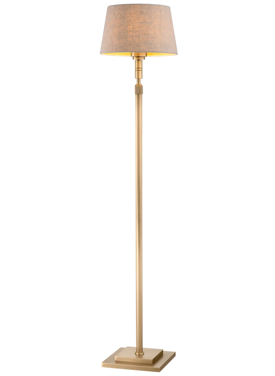 Lampa podłogowa Tryon marki Eichholtz w szczotkowanym mosiądzu, regulowanej wysokości z ręcznie wykonanym abażurem z mieszanki lnu. Wymiary: szer. 20 | głęb. 20 | wys. 146,5 cm. Abażur: dół Ø 25 | góra Ø 20 | wys. 15,5 cm