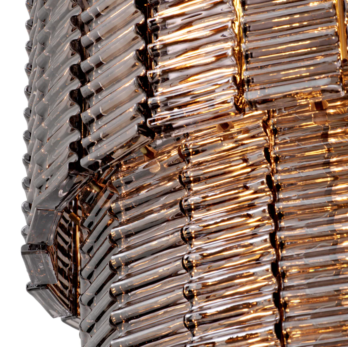 Żyrandol Imperial marki Eichholtz ze szczotkowanego mosiądzu, ozdobiony dymionym szkłem, oddaje ducha starożytnej greckiej architektury, łącząc historyczny urok z nowoczesną finezją. Wymiary: Ø 44 | wys.106 cm