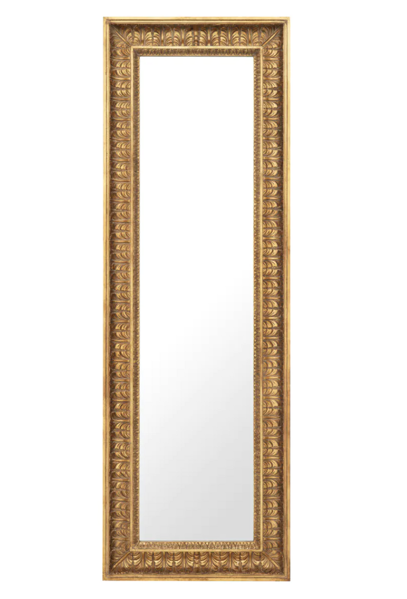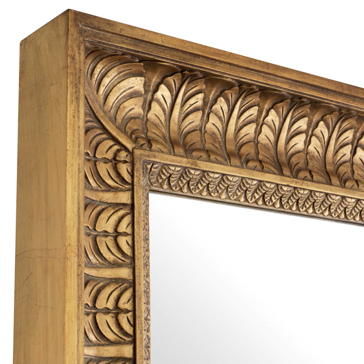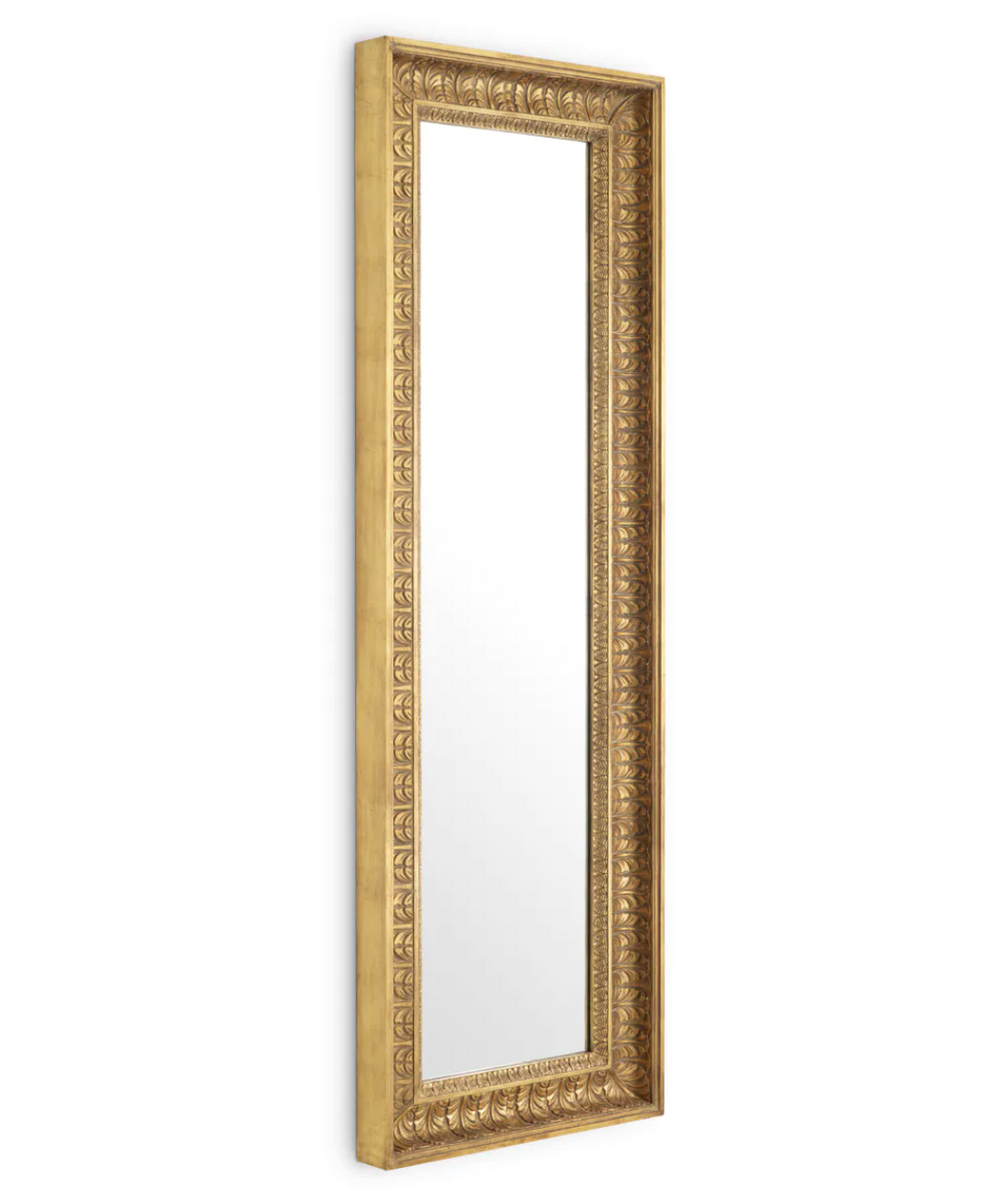 Lustro Sahure L marki Eichholtz w odcieniu antycznego złota, zachwyca delikatnymi motywami liści akantu i wolut jońskich, odzwierciedlając elegancję starożytnej rzymskiej architektury. Wymiary: wys. 176 x szer. 57 x głęb. 8,5 cm
