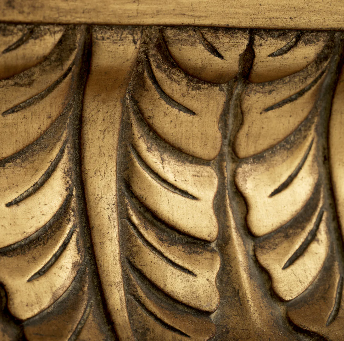 • Lustro Sahure L marki Eichholtz w odcieniu antycznego złota, zachwyca delikatnymi motywami liści akantu i wolut jońskich, odzwierciedlając elegancję starożytnej rzymskiej architektury.