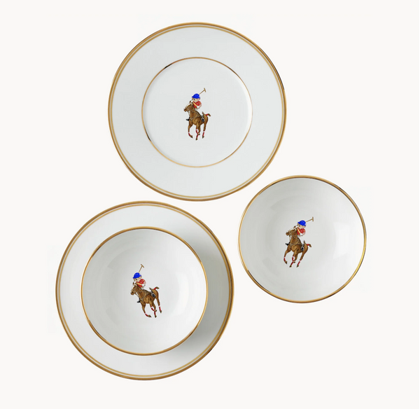• Zestaw zawiera dwa talerzyki deserowe i dwie miseczki, zapakowane w specjalne pudełko prezentowe z odświętnym, czerwonym wnętrzem. Wykonany z porcelany z pasami złota i uroczym wizerunkiem misia Polo i kucyka Pony marki Ralph Lauren.