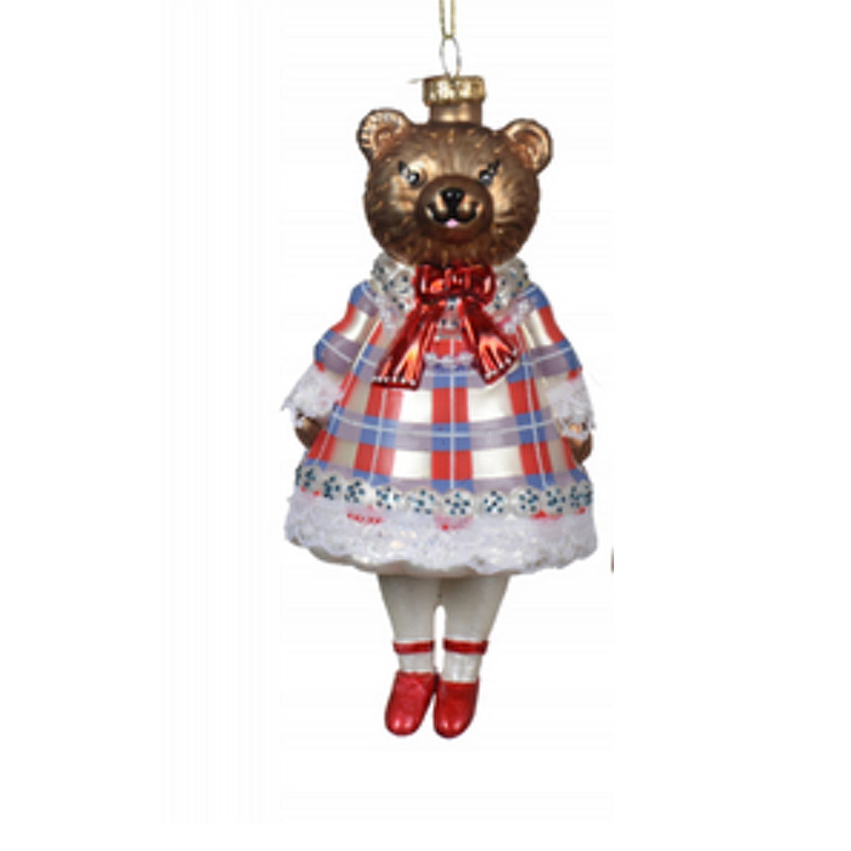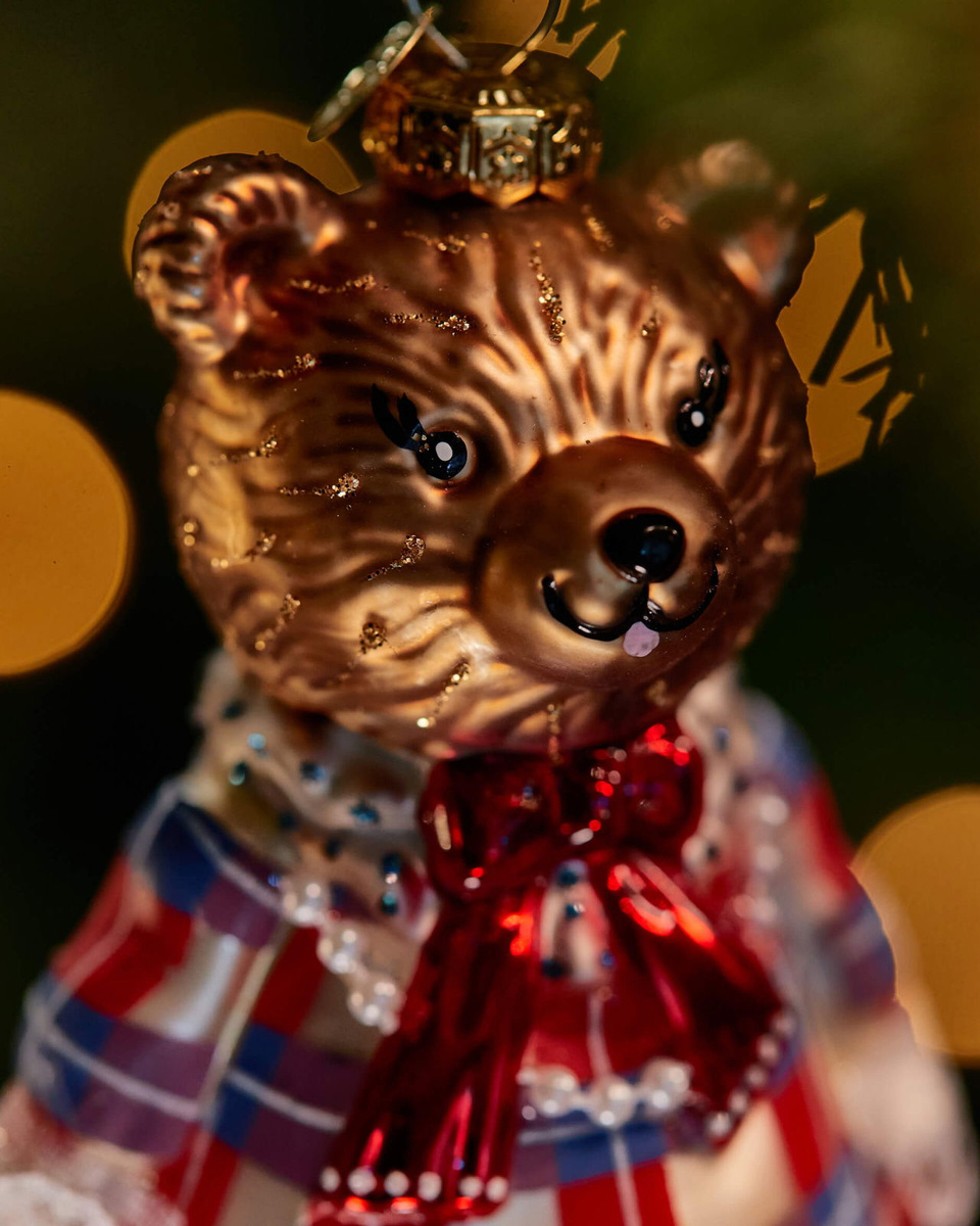 Ozdoba świąteczna - Pani Misiowa w ręcznie malowanej sukience, z subtelnymi zdobieniami i realistycznymi rysami twarzy. Wykonana z dmuchanego szkła. Wymiary: wys. 15,5 x szer. 7 x dł. 7,3 cm