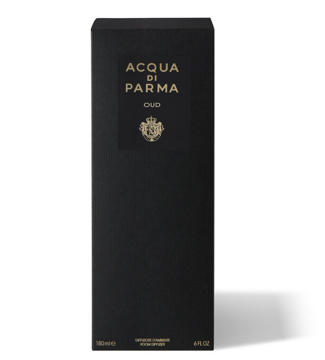 Perfumy dla domu Oud marki Acqua Di Parma, w czarnym, lakierowanym szkle z rattanowymi patyczkami roztaczają zmysłowy aromat oudu. Nuty bergamotki, amyrisu, kolendry, cedru, skóry i paczuli tworzą bogatą, tajemniczą kompozycję. Pojemność: 180 ml