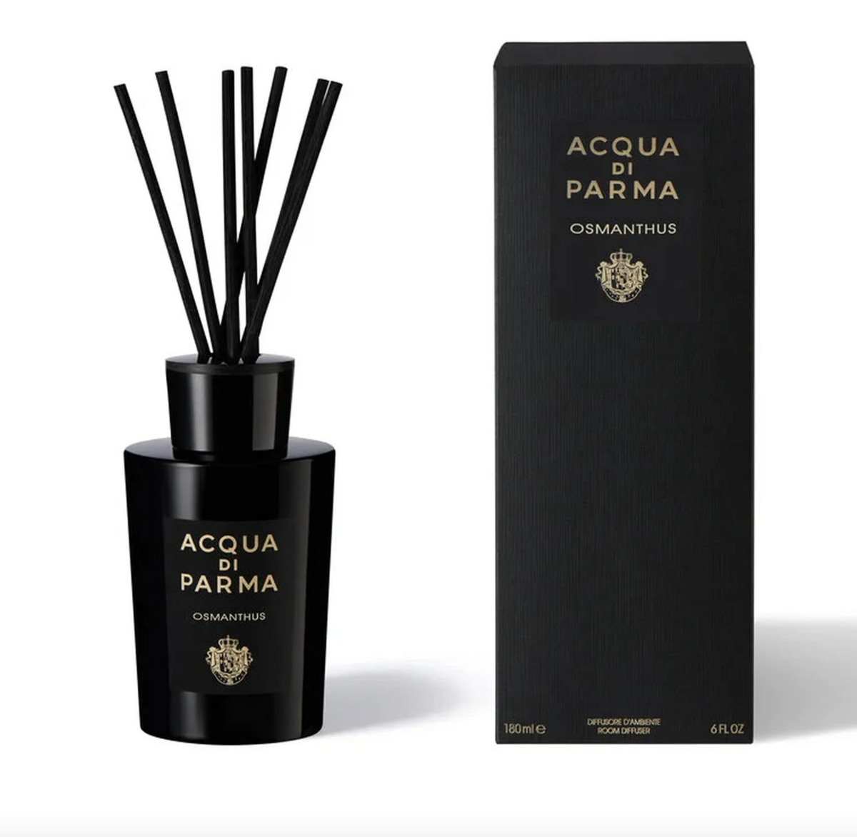 Perfumy dla domu Osmanthus marki Acqua Di Parma emanuje aromatem kwiatów osmantusa. W czarnym, lakierowanym szkle z rattanowymi patyczkami roztacza nuty mandarynki, neroli, piwonii i różowego pieprzu z głębią paczuli i osmantusa. Pojemność: 180 ml