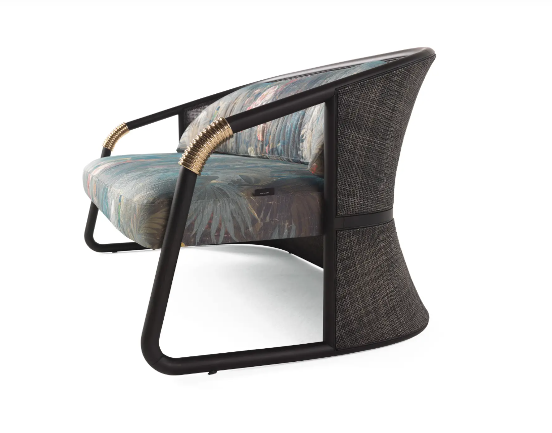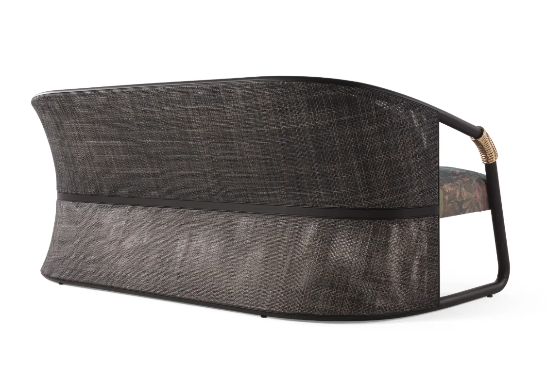 - Sofa dwuosobowa Hamar marki Etro Home łączy egzotyczny charakter rattanu z afrykańskimi akcentami mosiężnych pierścieni. Konstrukcja z drewna barwionego na matowy ciemny brąz, tkanina o tropikalnym wzorze.