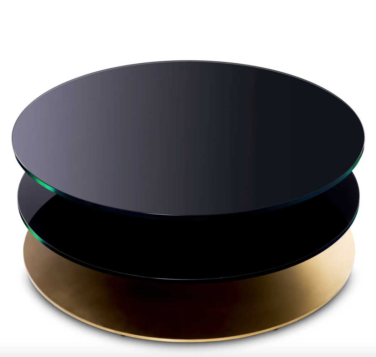- Stolik kawowy Dorado marki Eichholtz ze szczotkowanego mosiądzu. Okrągłe formy oraz połączenie mosiądzu z czarnym szkłem tworzą harmonijny, nowoczesny design o ponadczasowej elegancji.