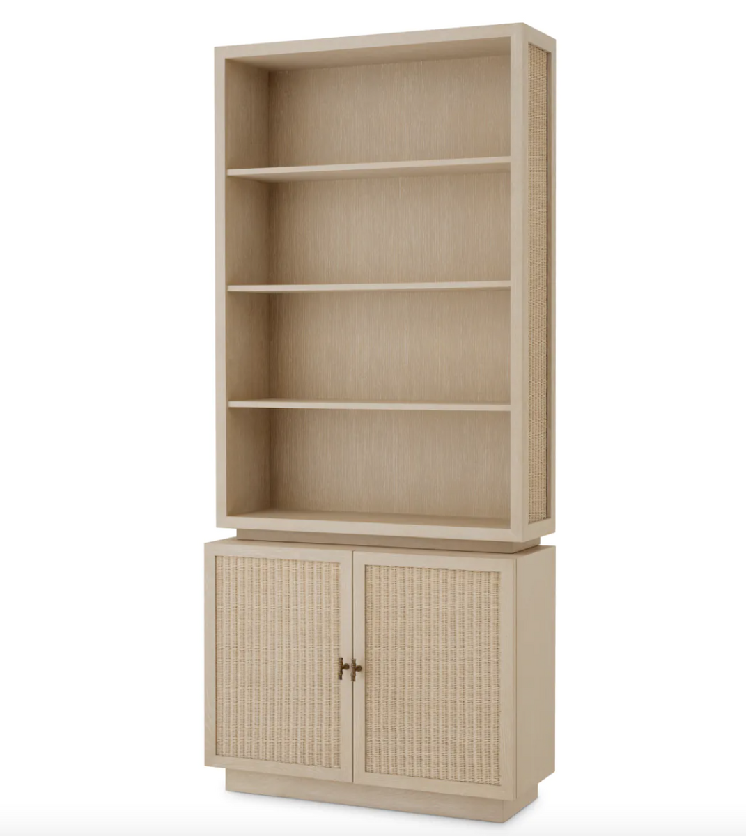 • Regał Borchard marki Eichholtz wykonany z dębowej okleiny w jasnym wykończeniu z delikatnie plecionym rattanem. Subtelne faktury i ciepła, neutralna paleta tworzą harmonijny design.