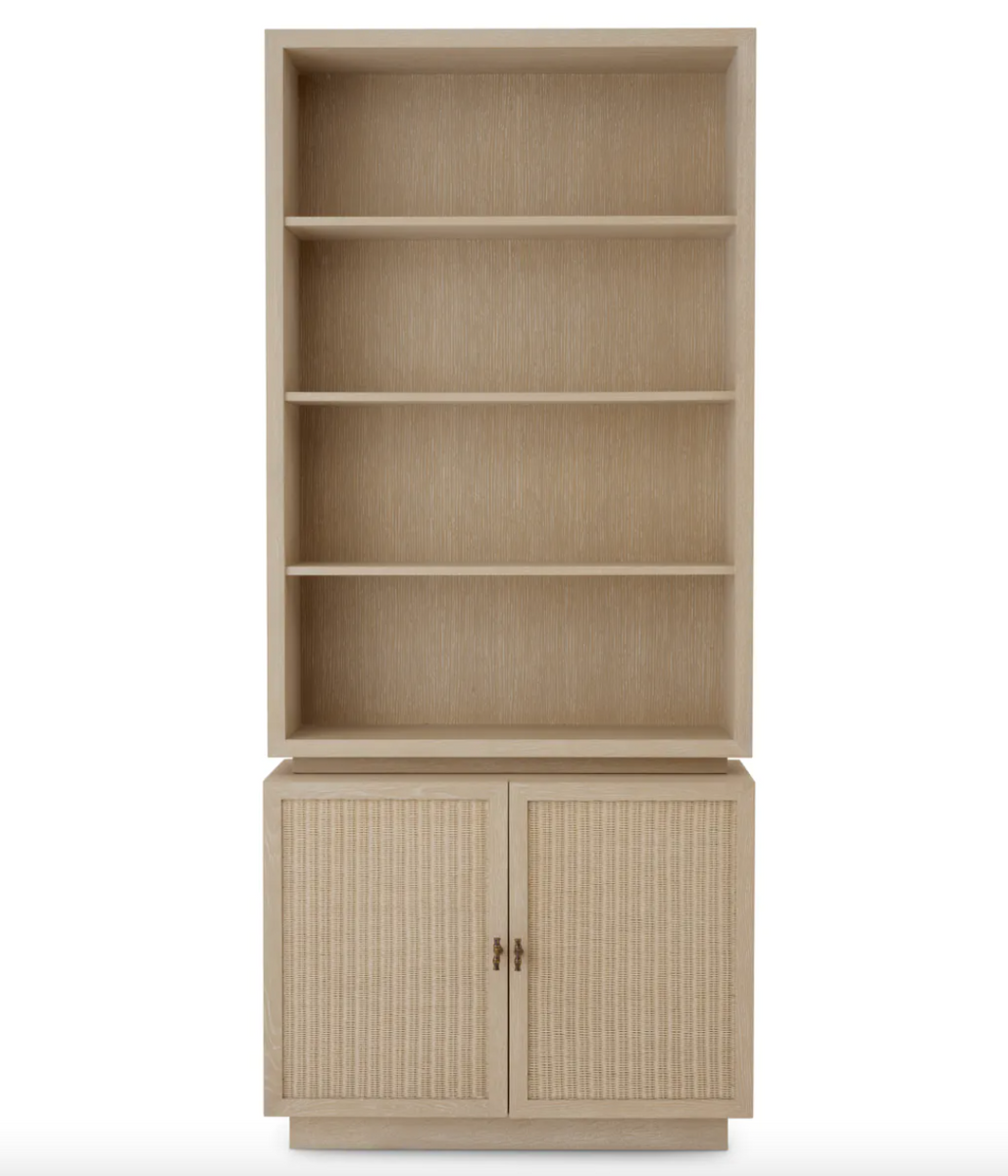 Regał Borchard marki Eichholtz wykonany z dębowej okleiny w jasnym wykończeniu z delikatnie plecionym rattanem. Subtelne faktury i ciepła, neutralna paleta tworzą harmonijny design. Wymiary: szer. 105 | gł. 45 | wys. 240 cm